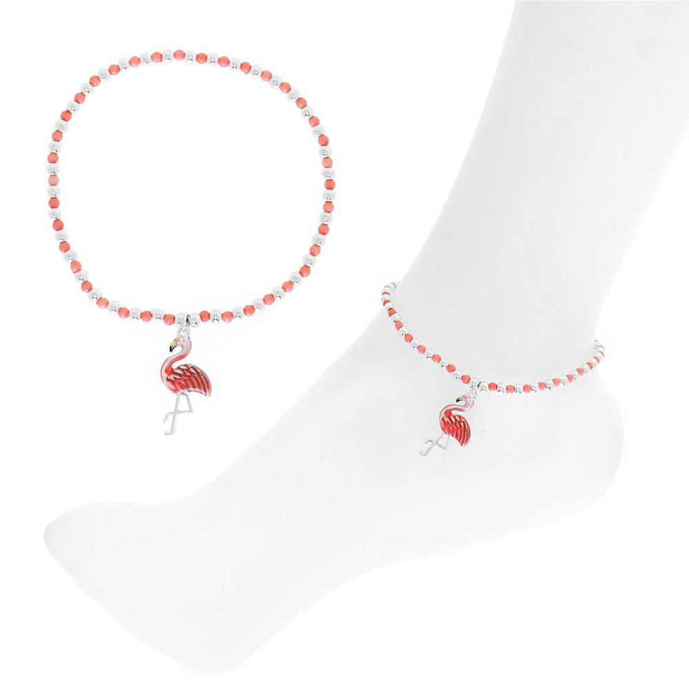 PINK FLAMINGO ENAMEL COATED BEADED STRETCH ANKLET IN SILVER TONE METAL