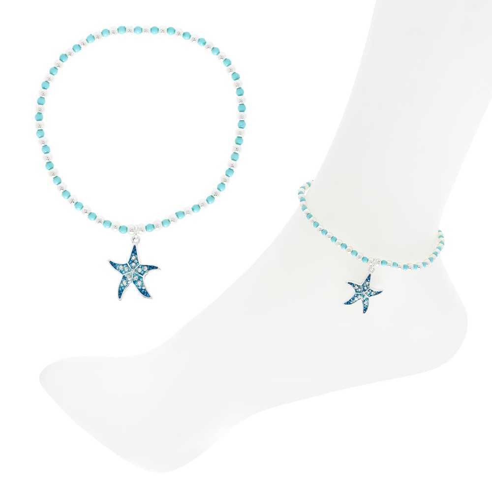 SEA LIFE STAR FISH ENAMEL COATED BEADED STRETCH ANKLET IN SILVER TONE METAL