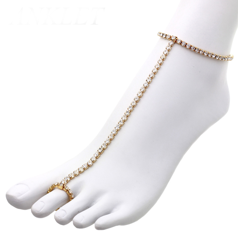 1 Line Rhinestone Anklet W/ Toe Ring Chain