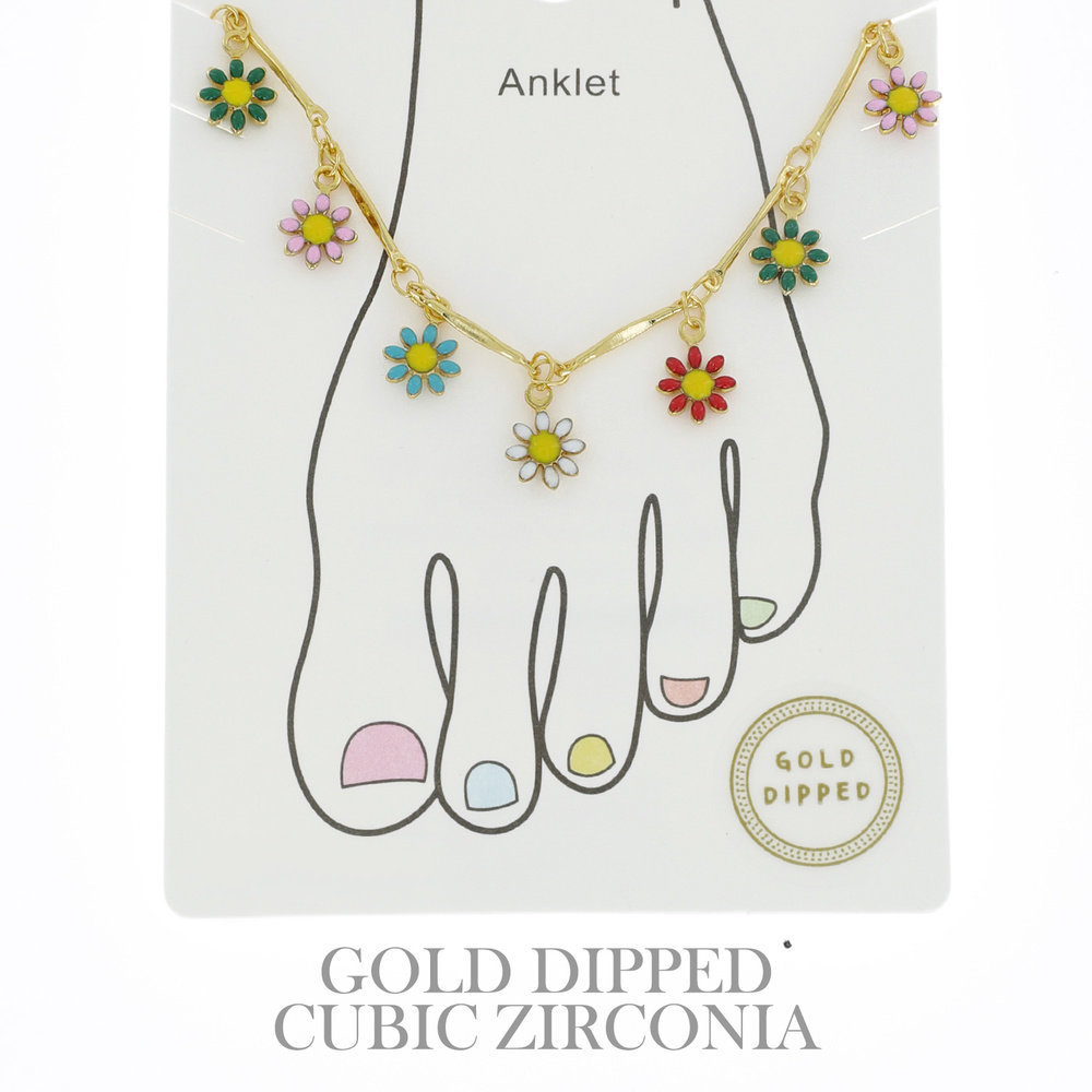 DAISY FLOWER ENAMEL COATED ADJUSTABLE CHARM ANKLET IN YELLOW GOLD AND WHITE GOLD PLATING