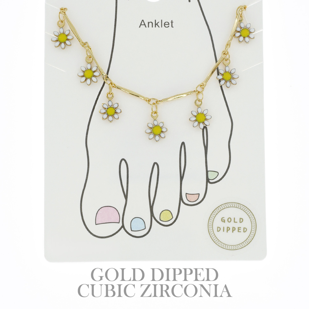 DAISY FLOWER ENAMEL COATED ADJUSTABLE CHARM ANKLET IN YELLOW GOLD AND WHITE GOLD PLATING