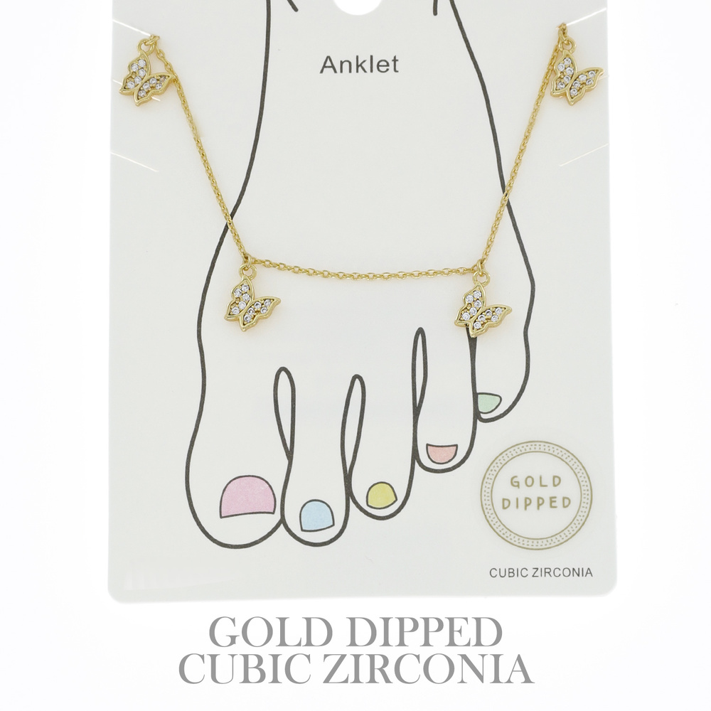 CUBIC ZIRCONIA PAVE BUTTERFLY ADJUSTABLE CHARM ANKLET IN YELLOW GOLD AND WHITE GOLD PLATING