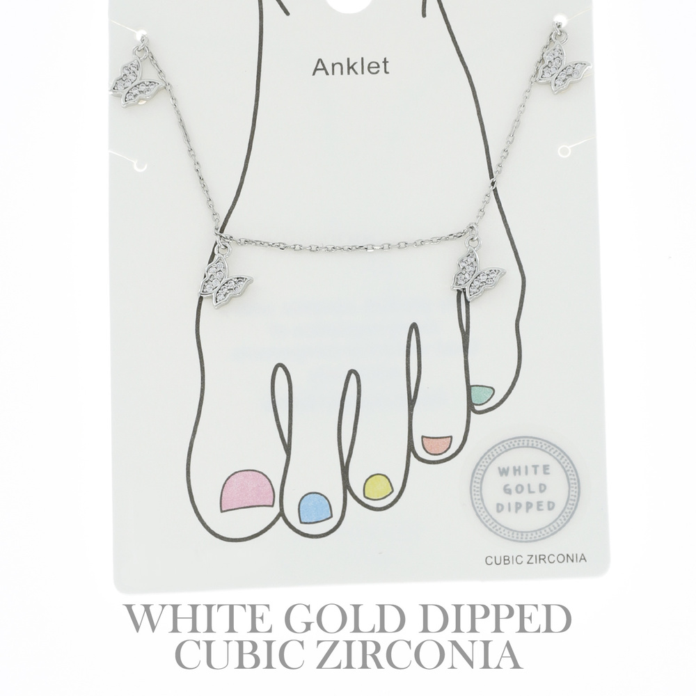 Cubic Zirconia Pave Butterfly Adjustable Charm Anklet In Yellow Gold And White Gold Plating