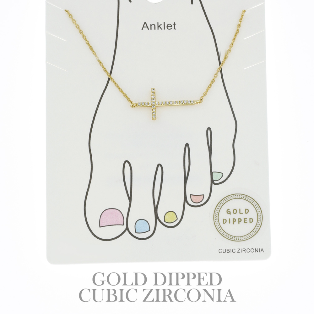 CUBIC ZIRCONIA PAVE HORIZONTAL CROSS CHAIN ANKLET IN YELLOW GOLD AND WHITE GOLD PLATING