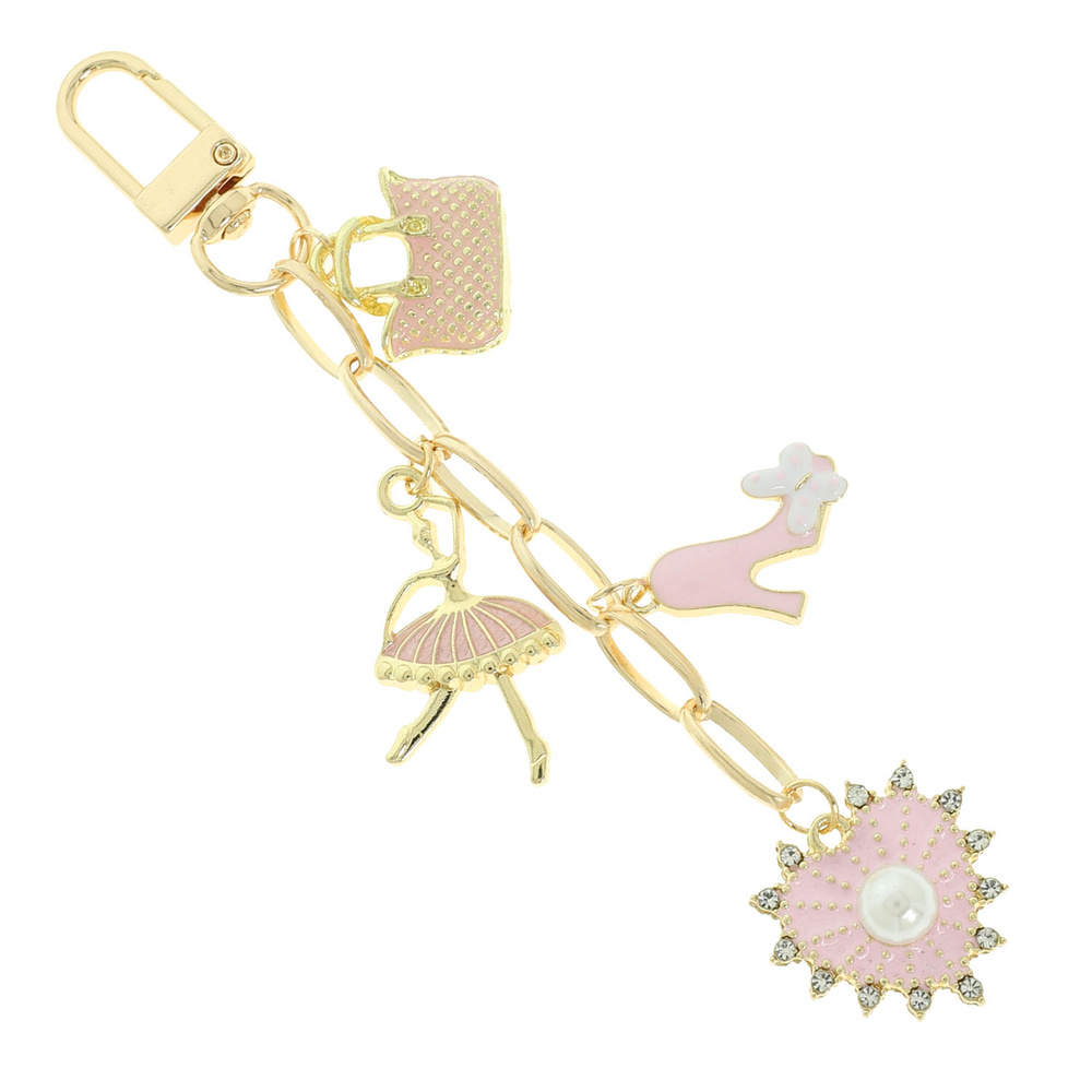 ENAMEL BAG CHARM CHAIN WITH SNAP HOOK CLASP FEATURES HANDBAG, BALLERINA , HIGHHEEL AND JEWELED HEART TRINKET