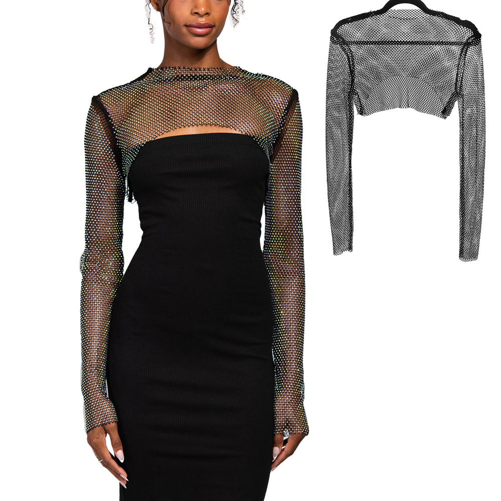 WOMEN'S FISHNET CRYSTAL RHINESTONE EMBELLISHED PARTY CROPPED LONG SLEEVE SHRUG BOLERO TOP