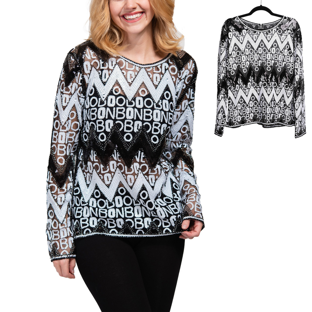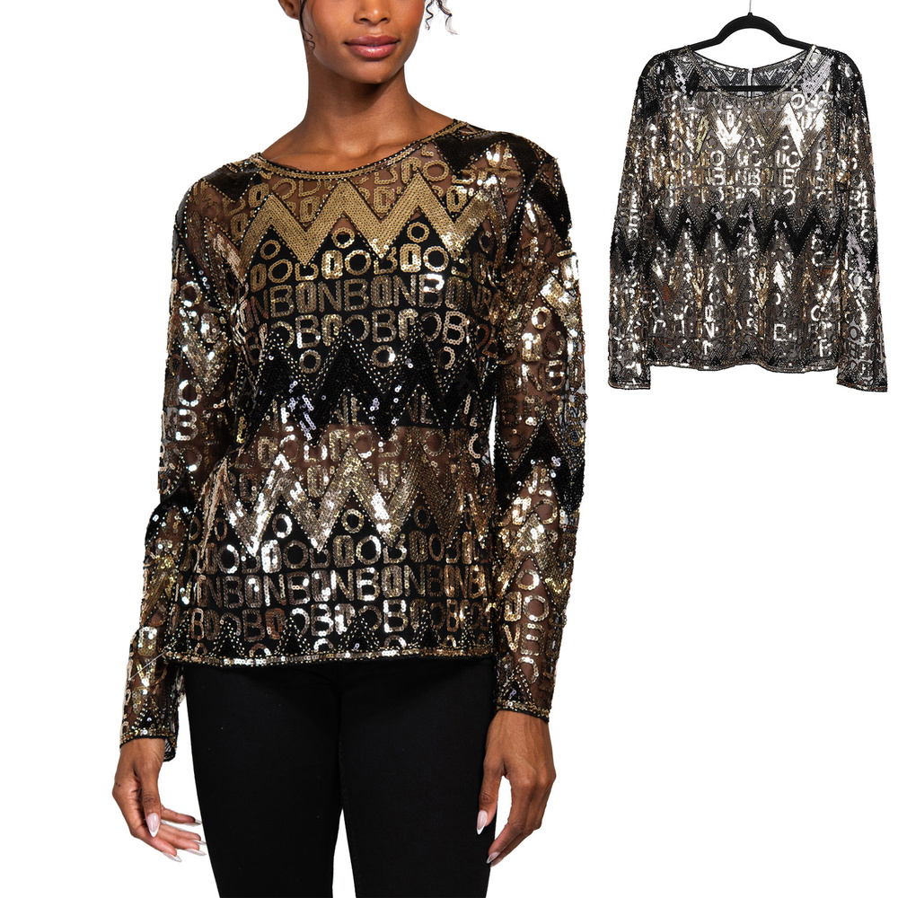 SEQUIN CHEVRON PATTERN LONG SLEEVE TRANSPARENT BLOUSE