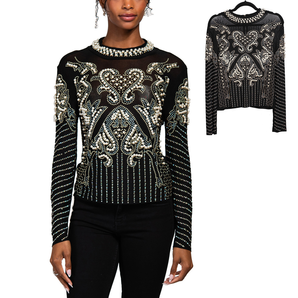 WOMEN'S PEARL AND CRYSTAL RHINESTONE SHEER LONG SLEEVE BLOUSE