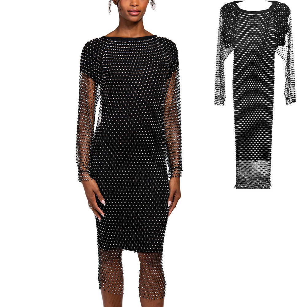 WOMEN'S CRYSTAL RHINESTONE FISHNET MESH LINED DOUBLE LAYER LONG SLEEVE MIDI DRESS