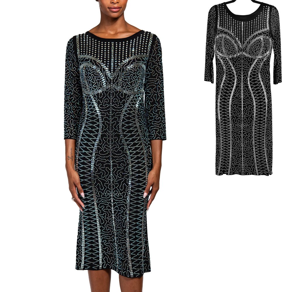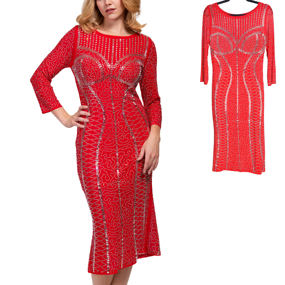 WOMEN'S CRYSTAL RHINESTONE STUDDED BODYCON LONG SLEEVE MIDI DRESS
