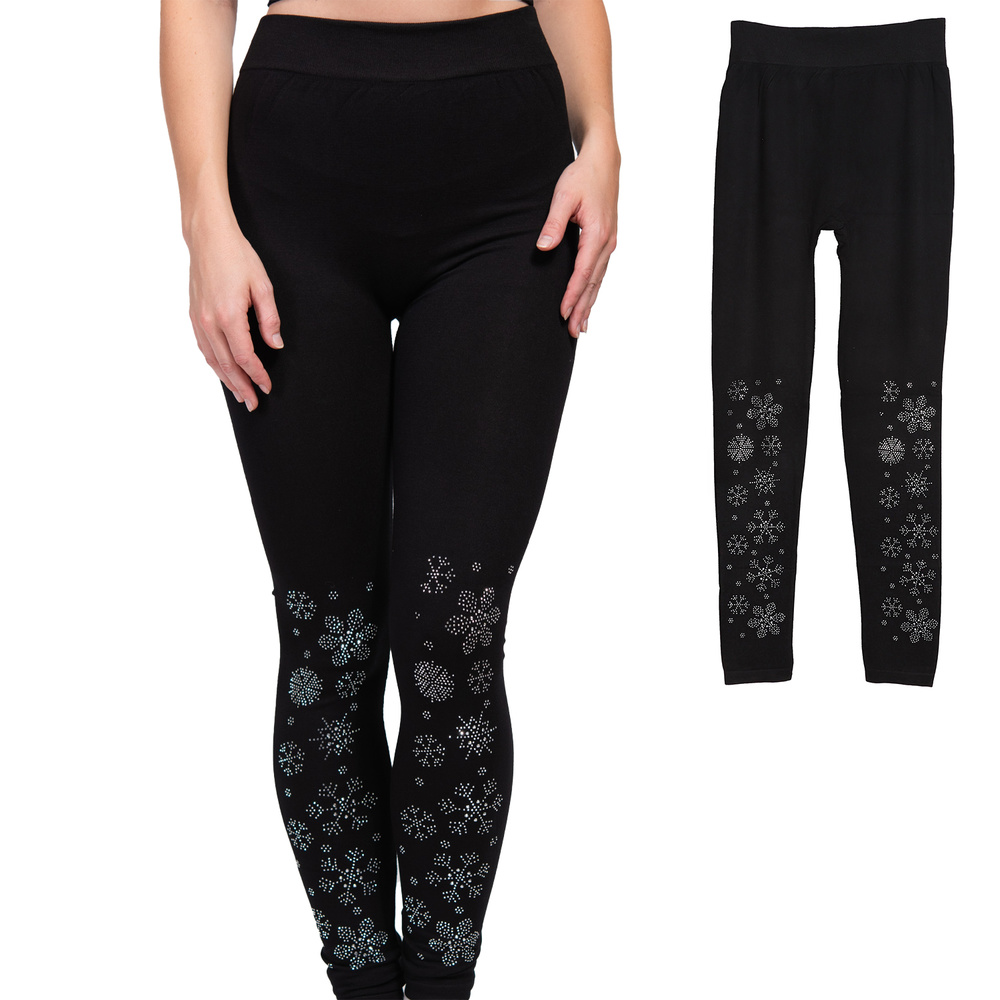 WOMEN'S CRYSTAL RHINESTONE STUDDED WINTER WONDERLAND SNOWFLAKE DESIGN HIGH WAISTED BLACK CHRISTMAS LEGGINGS