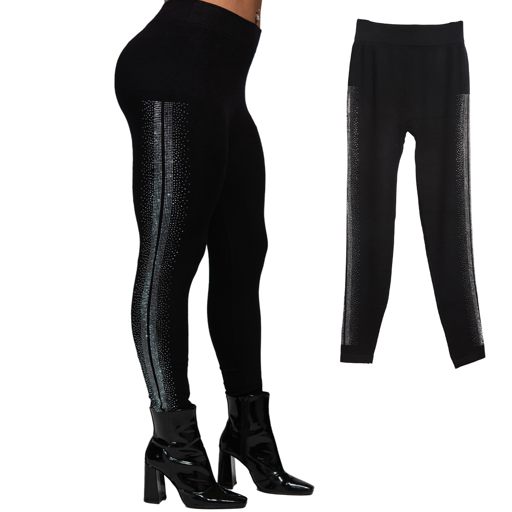 PLUS SIZE WOMEN'S SIDE SEAM CRYSTAL RHINESTONE STUDDED GRADIENT DESIGN HIGH WAISTED BLACK LEGGINGS