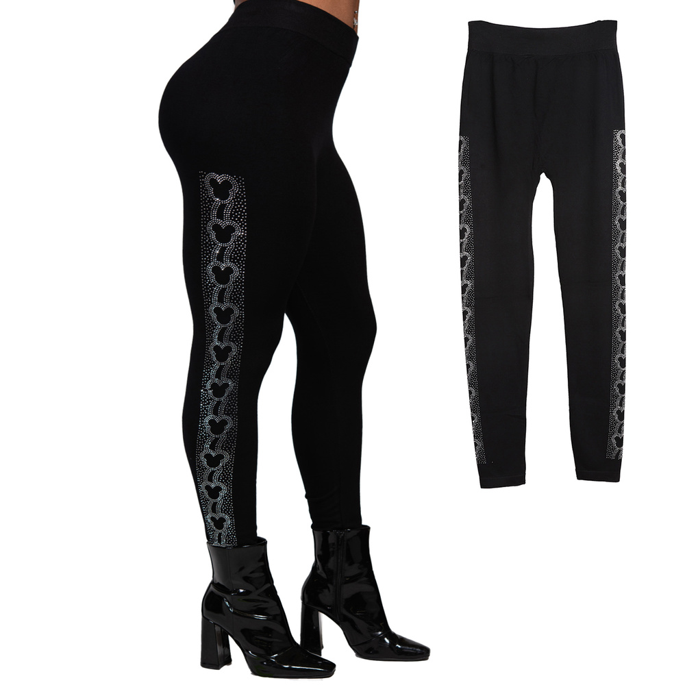 WOMEN'S SIDE SEAM CRYSTAL RHINESTONE STUDDED MOUSE EARS DESIGN HIGH WAISTED BLACK LEGGINGS
