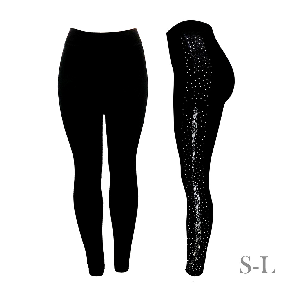 Crystal Rhinestone Studded High Waisted Elastic Waist Lace Side Panel Black Athleisure Leggings