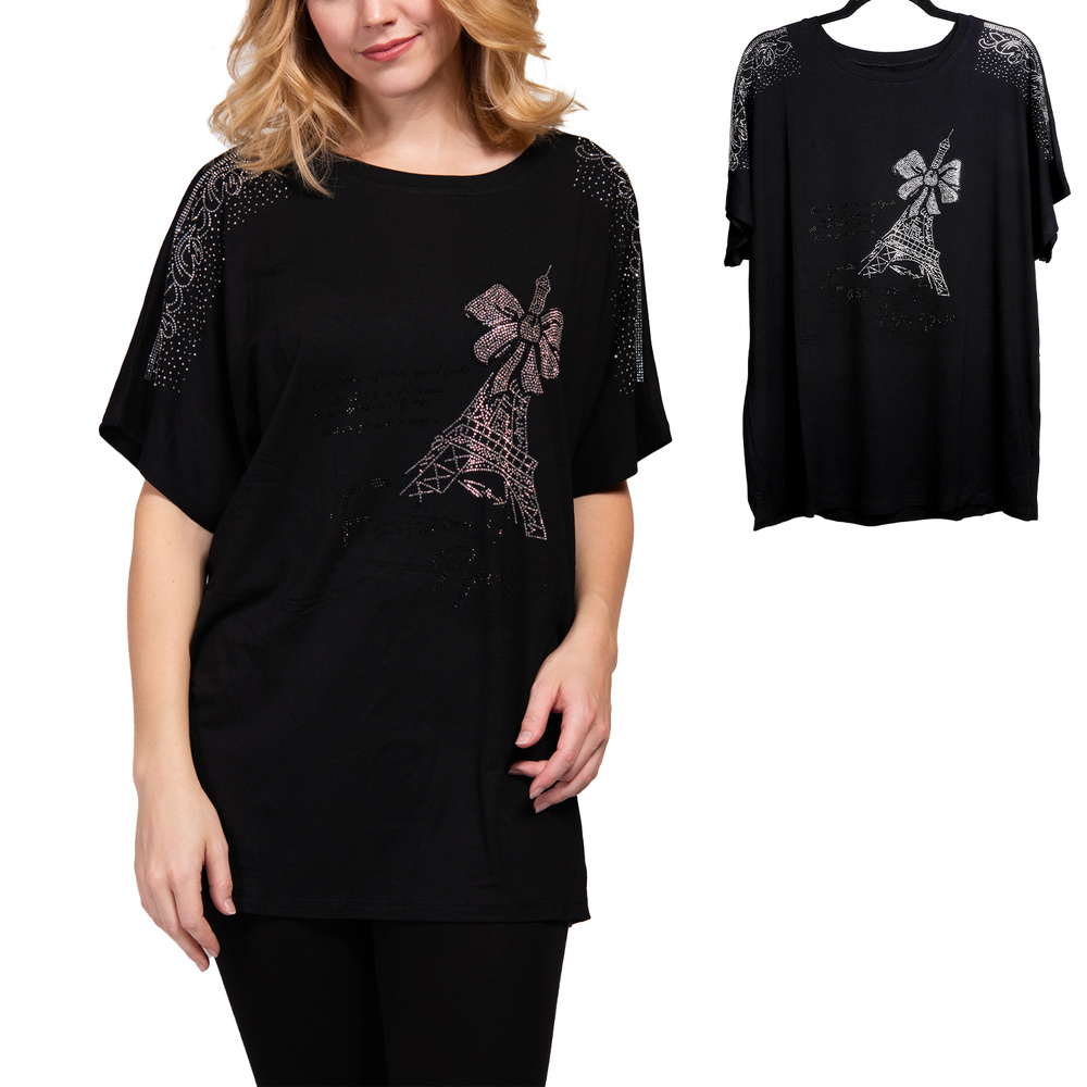 CRYSTAL RHINESTONE EIFFEL TOWER DESIGN BLACK SHORT SLEEVE GRAPHIC CREW NECK T-SHIRT