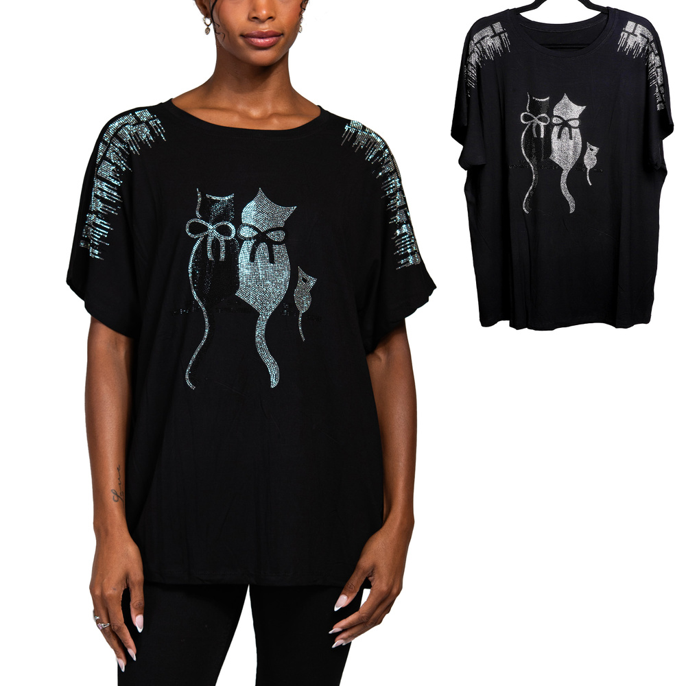 CRYSTAL RHINESTONE CAT DESIGN BLACK SHORT SLEEVE GRAPHIC CREW NECK T-SHIRT