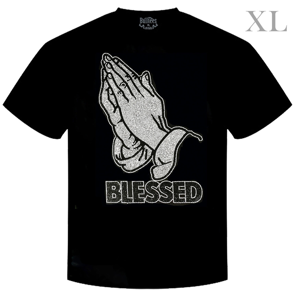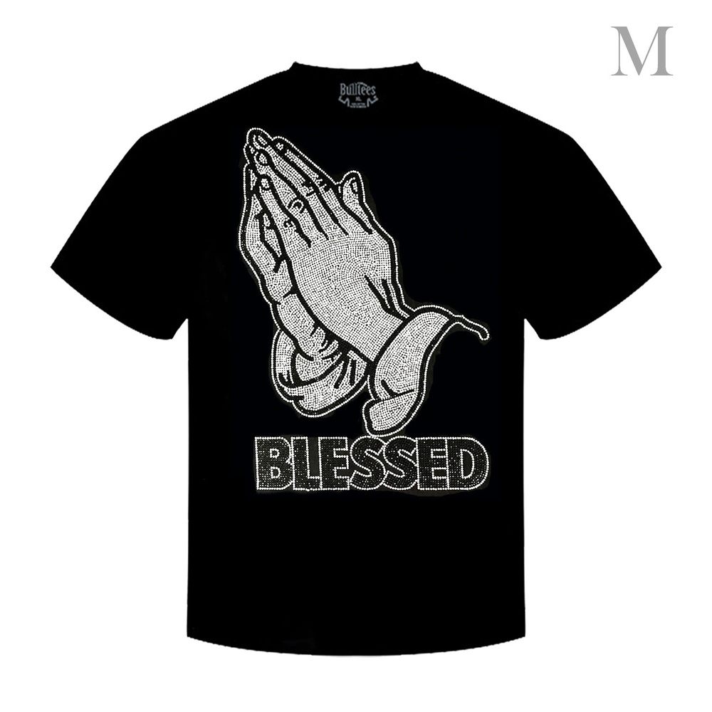 PRAYING HANDS "BLESSED" CRYSTAL RHINESTONE STUDDED CREW NECKLINE SHORT SLEEVE GRAPHIC T-SHIRT IN BLACK