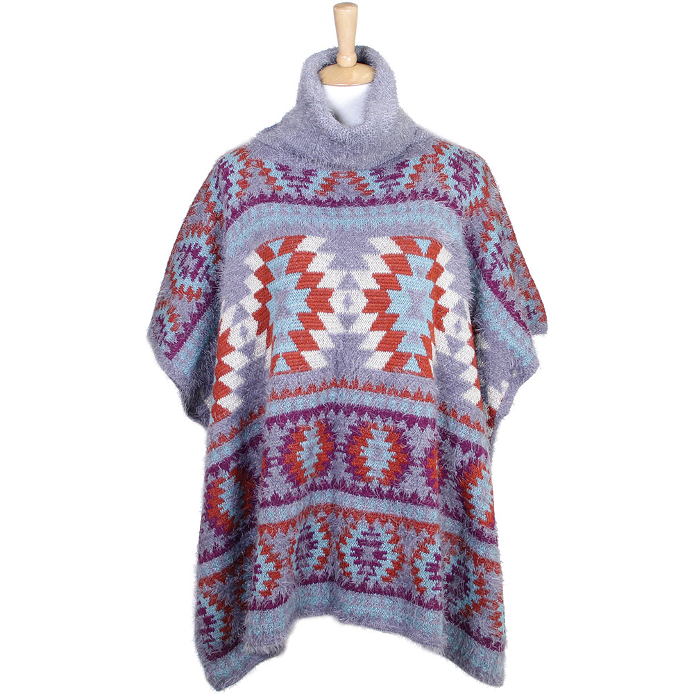 Aztec Pattern Fuzzy Knit Fashion Poncho Lof362grey