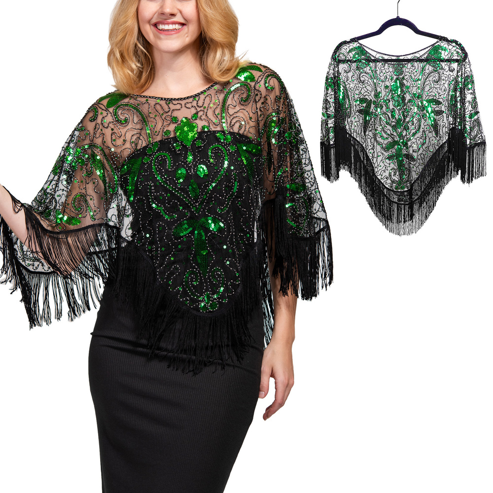 VINTAGE VINE PATTERN SEQUIN EMBROIDERED EVENING FORMAL SHEER FRINGE WRAP CAPE SHAWL