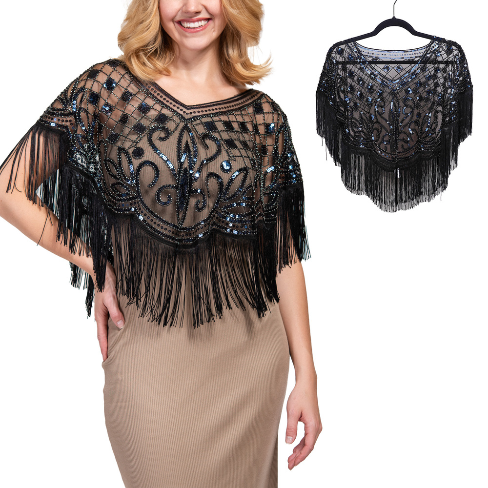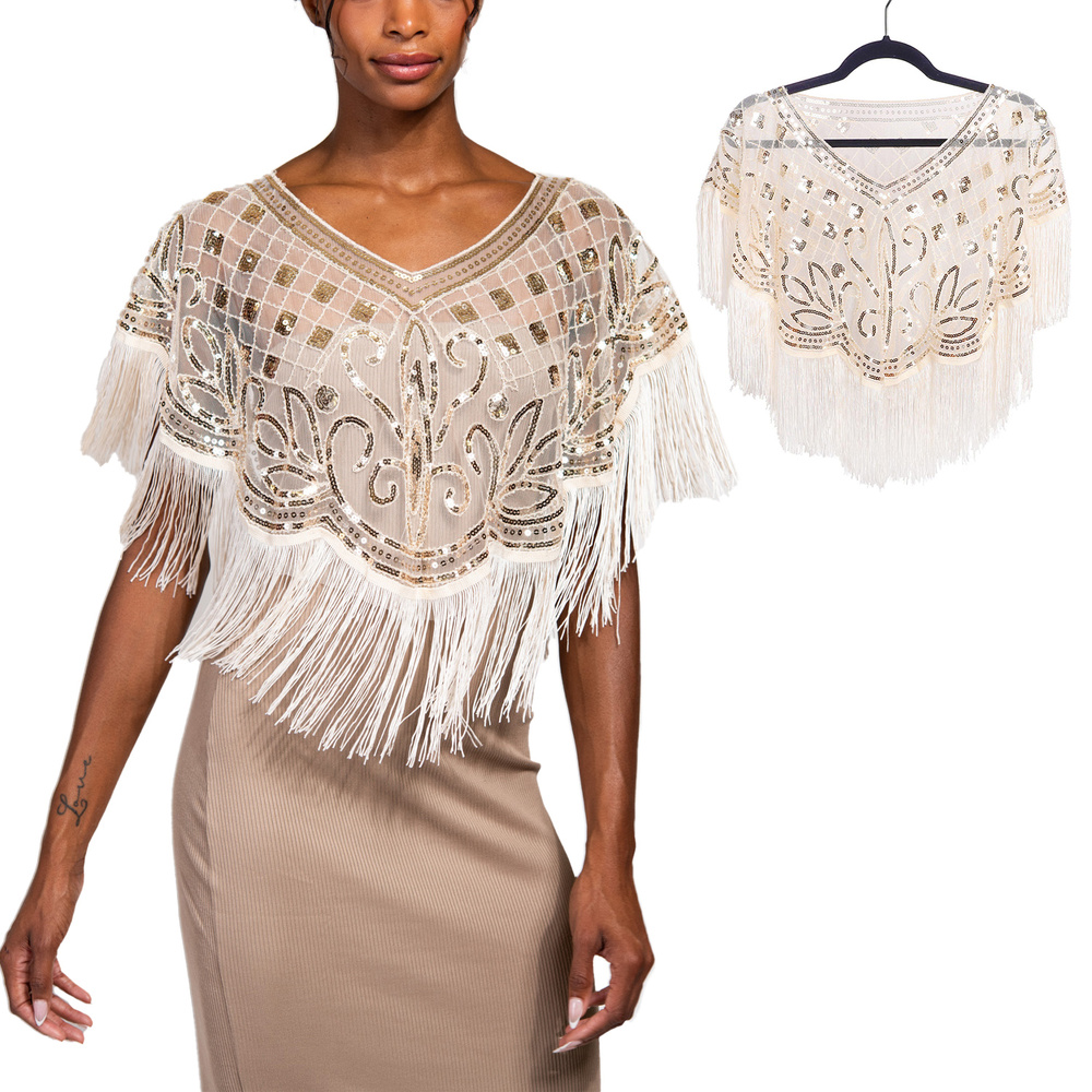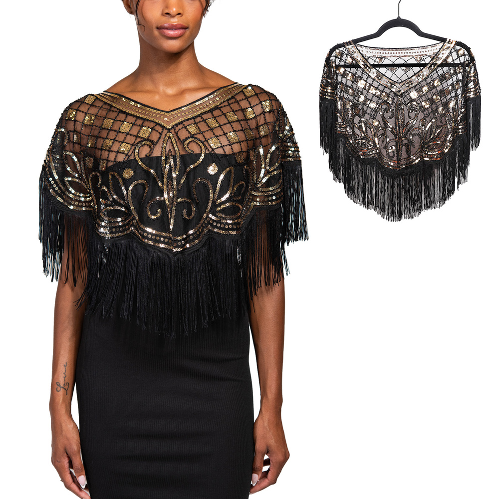 VINTAGE VINE PATTERN SEQUIN EMBROIDERED EVENING FORMAL SHEER FRINGE WRAP CAPE SHAWL