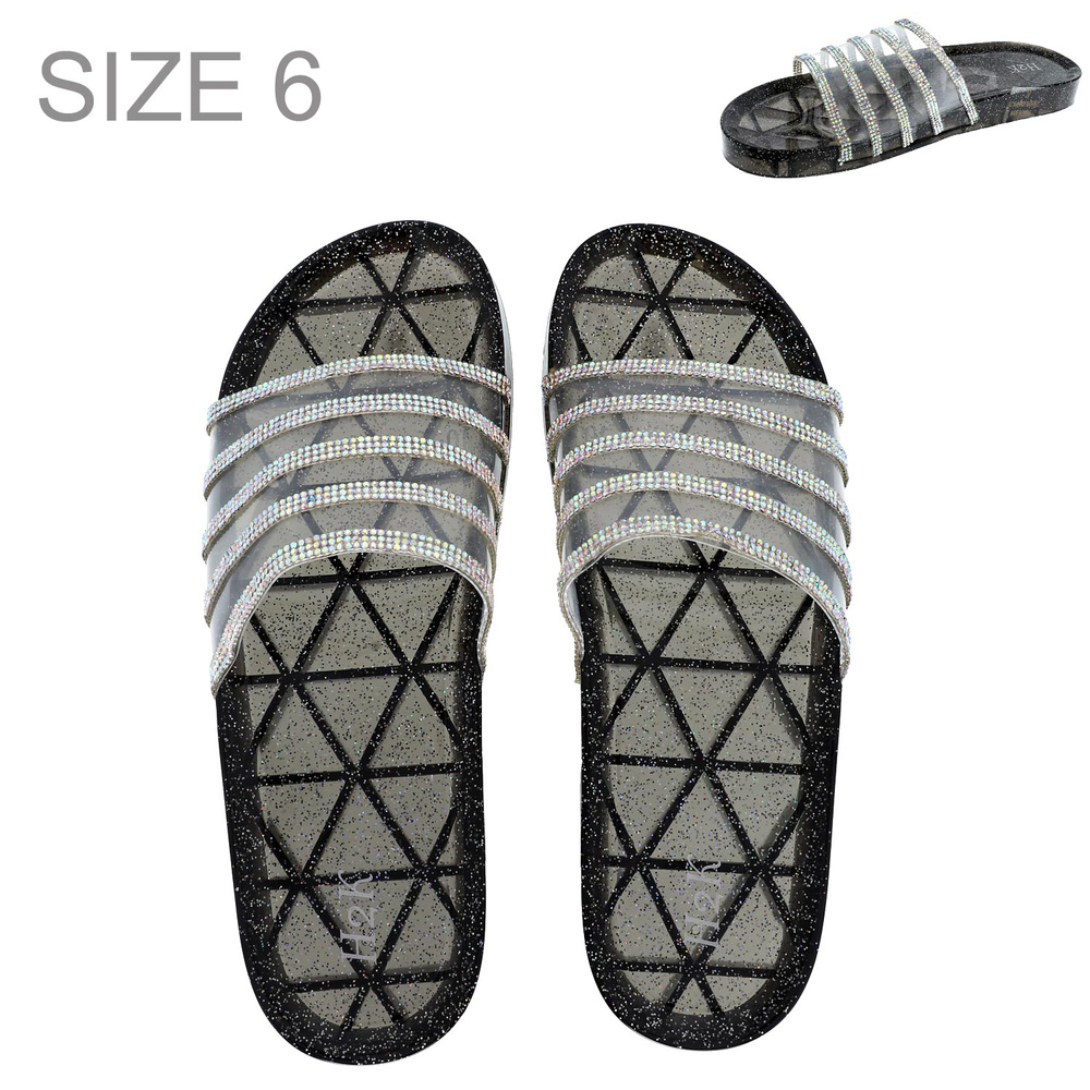 BLACK WOMEN'S CRYSTAL RHINESTONE STUDDED TRANSPARENT GLITTER JELLY FLAT SLIP-ON STRIPED SLIDES