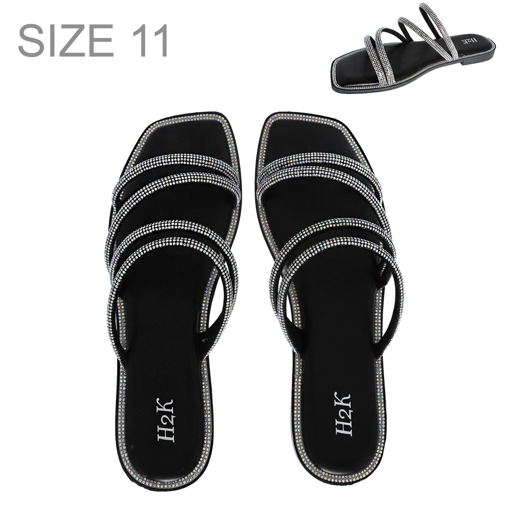 BLACK WOMEN'S CRYSTAL RHINESTONE FLAT STRAPPY SANDALS