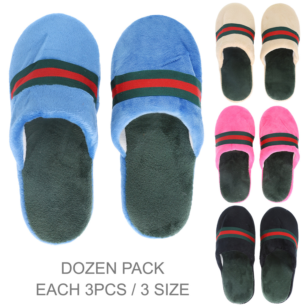 12 PACK - 4 STYLES- 3 PIECES EACH STYLE - WOMEN'S STRIPED SOFT PLUSH HOUSE PAJAMA SLIPPERS