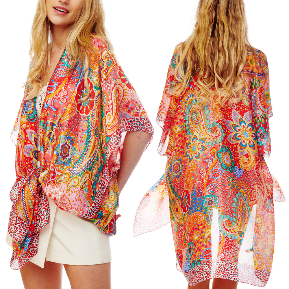 FLORAL PAISLEY PRINTED SILKY TRANSLUCENT COVER-UP WOMEN'S KIMONO