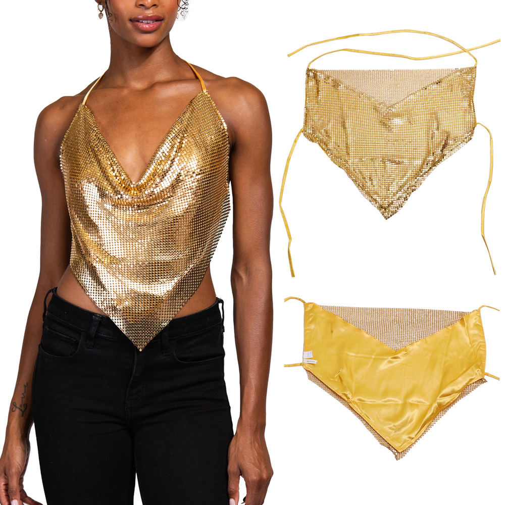 METALLIC SEQUIN BANDANA BACKLESS HALTER TOP