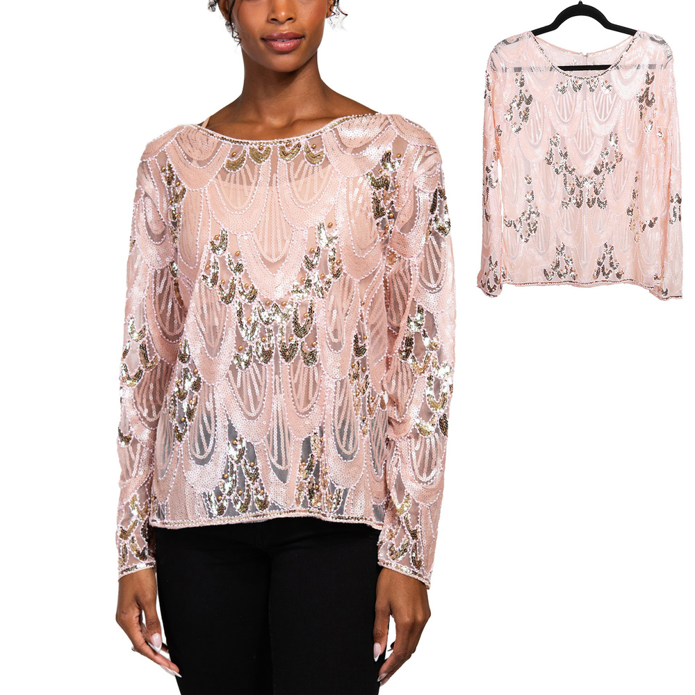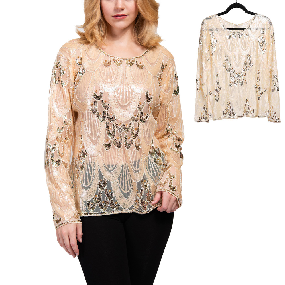 ART DECO SCALLOPED SEQUIN EMBELLISHED SEMI SHEER ROUND NECK LONG SLEEVE EVENING TOP