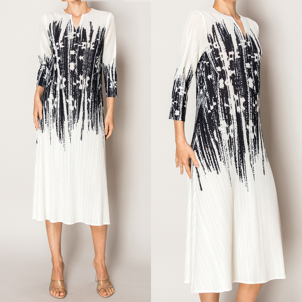 PLEATED MONOCHROME ABSTRACT PRINT A-LINE V-NECK MIDI DRESS