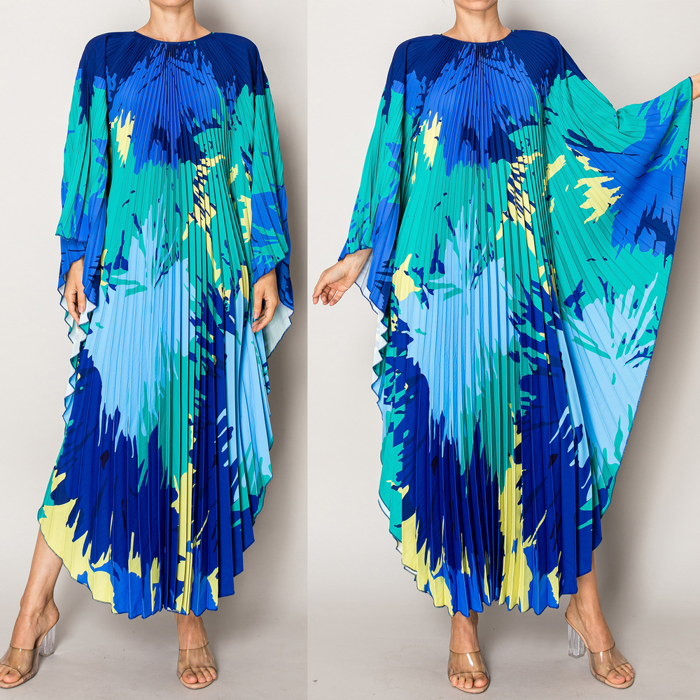 VIBRANT ABSTRACT PLEATED LONG SLEEVE CREW NECK CAFTAN STYLE DRESS