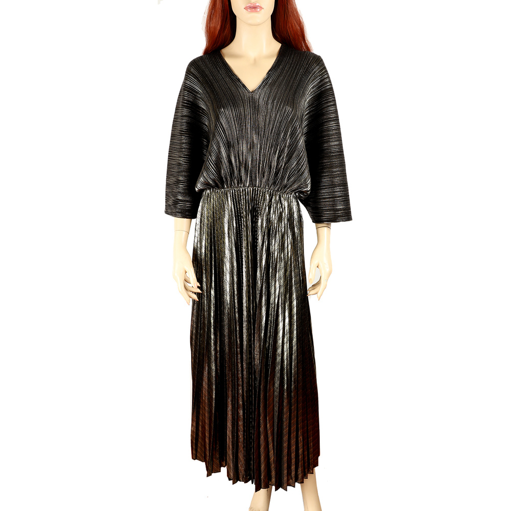 METALLIC ELBOW SLEEVE V-NECK PLEATED MIDI DRESS