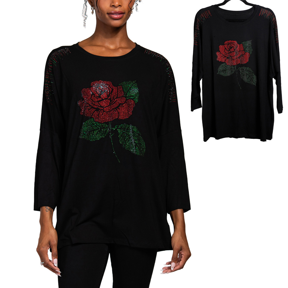 CRYSTAL RHINESTONE RED ROSE DESIGN BLACK LONG SLEEVE GRAPHIC CREW NECK T-SHIRT