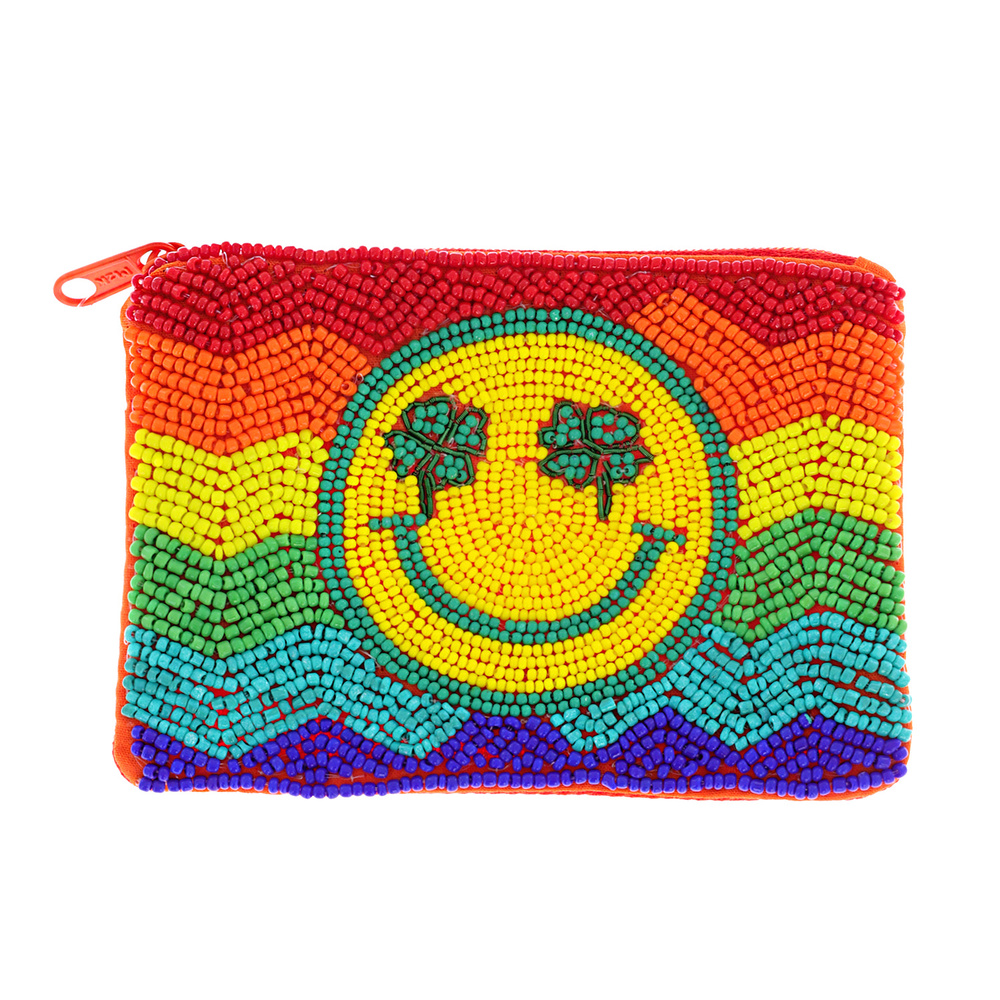 SAINT PATRICK'S DAY SMILEY FACE RAINBOW SEED BEAD HANDMADE BEADED ZIPPER COIN BAG