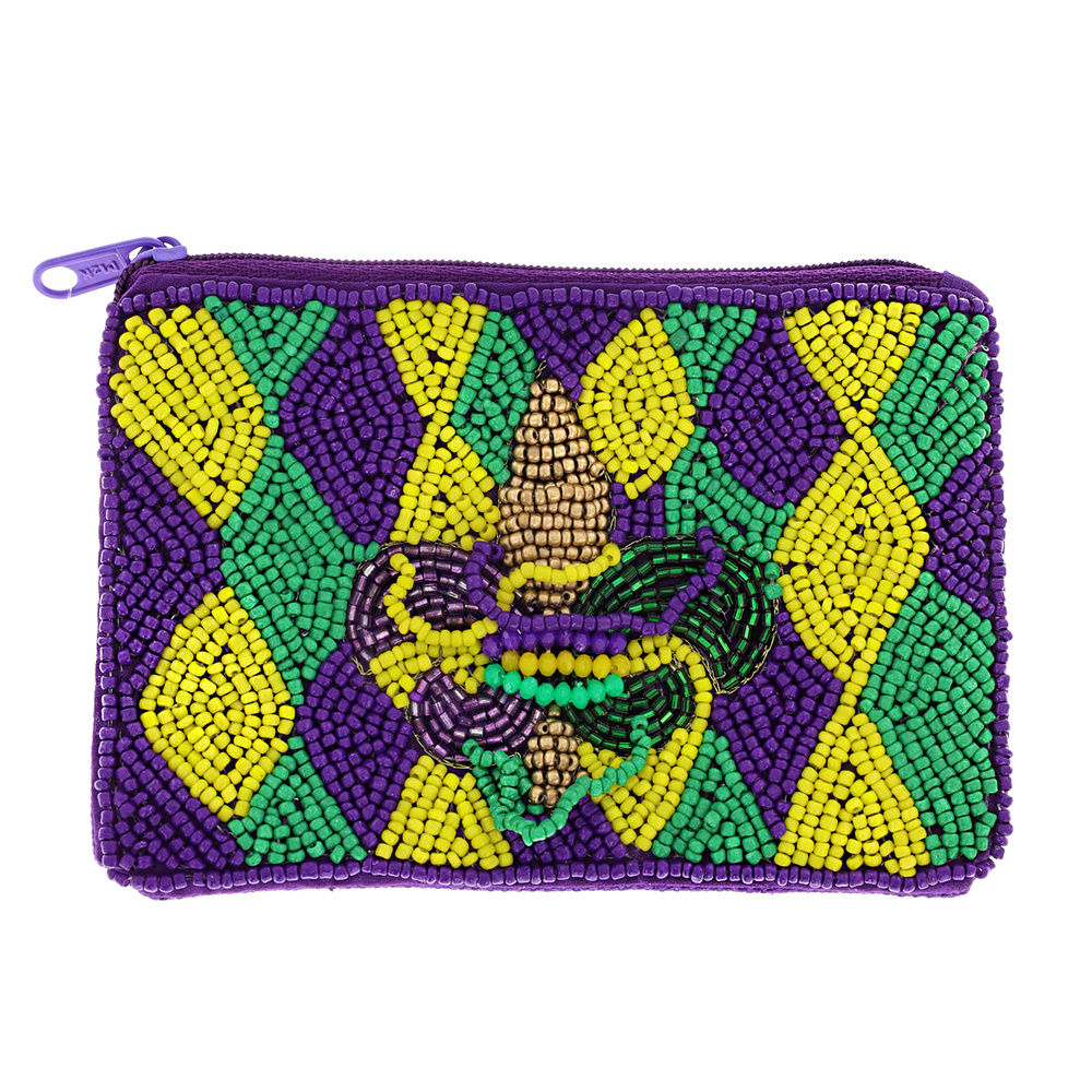 MARDI GRAS TRICOLOR FLEUR DE LIS DIAMOND PATTERN SEED BEAD HANDMADE BEADED ZIPPER COIN BAG