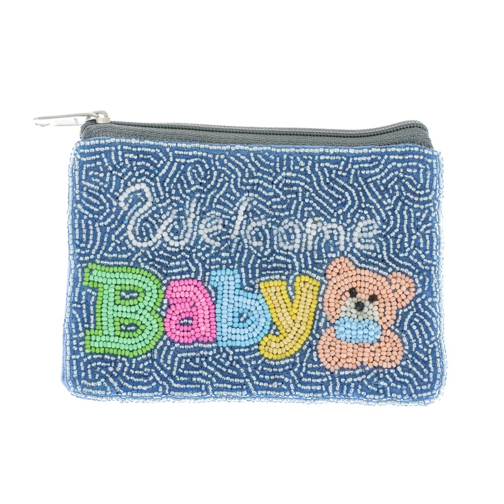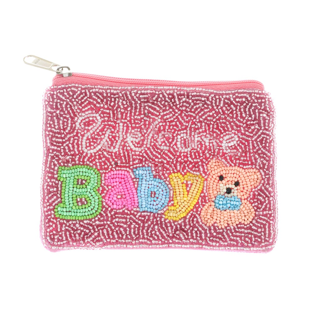 "WELCOME BABY" TEDDY BEAR SEED BEAD HANDMADE BEADED ZIPPER COIN BAG