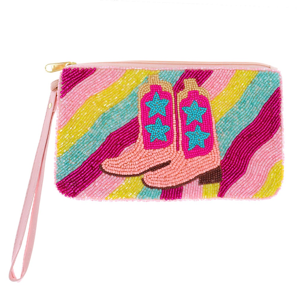 PINK COWBOY BOOTS SEED BEAD HANDMADE BEADED ZIPPER COIN BAG WITH WRISTLET STRAP