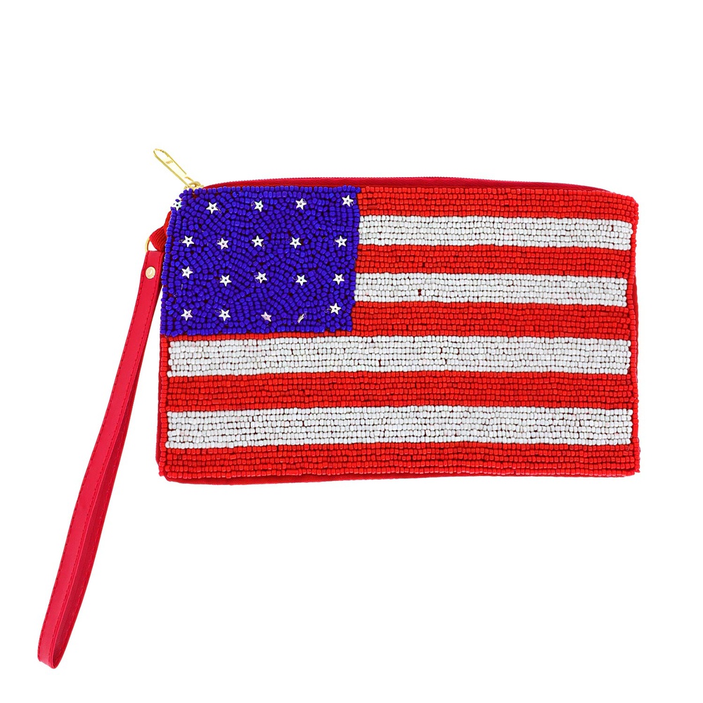 Patriotic Usa Flag Seed Bead Handmade Beaded Zipper Coin Bag With Wristlet Strap
