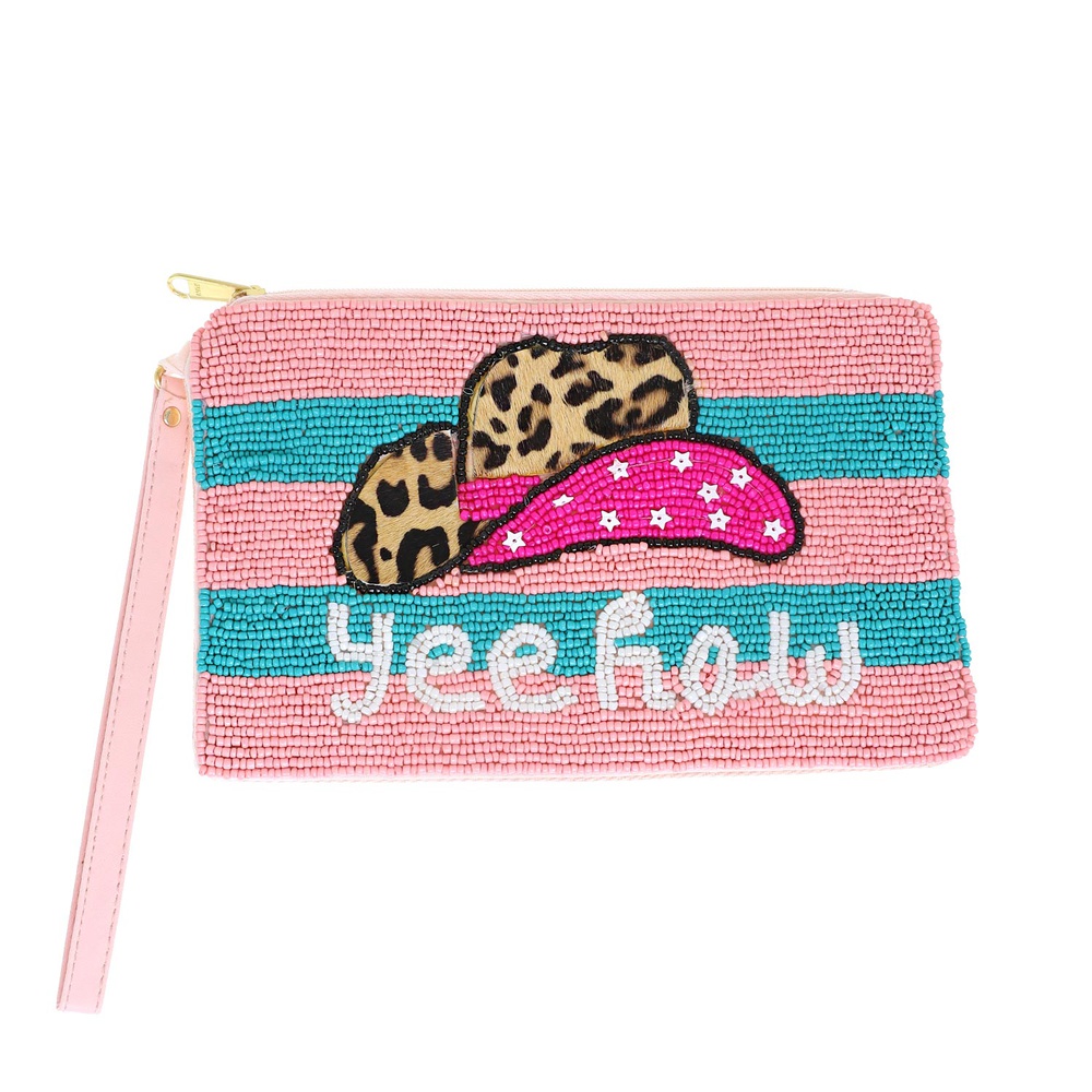 "YEEHAW" LEOPARD PRINT COWBOY HAT SEED BEAD HANDMADE BEADED STRIPED ZIPPER COIN BAG WITH WRISTLET STRAP