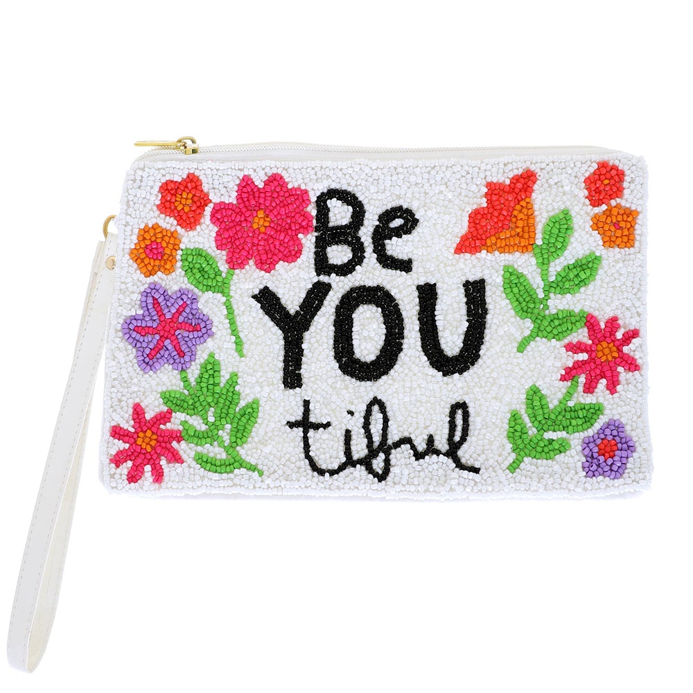 "BE-YOU-TIFUL" FLORAL SEED BEAD HANDMADE BEADED ZIPPER COIN BAG WITH WRISTLET STRAP