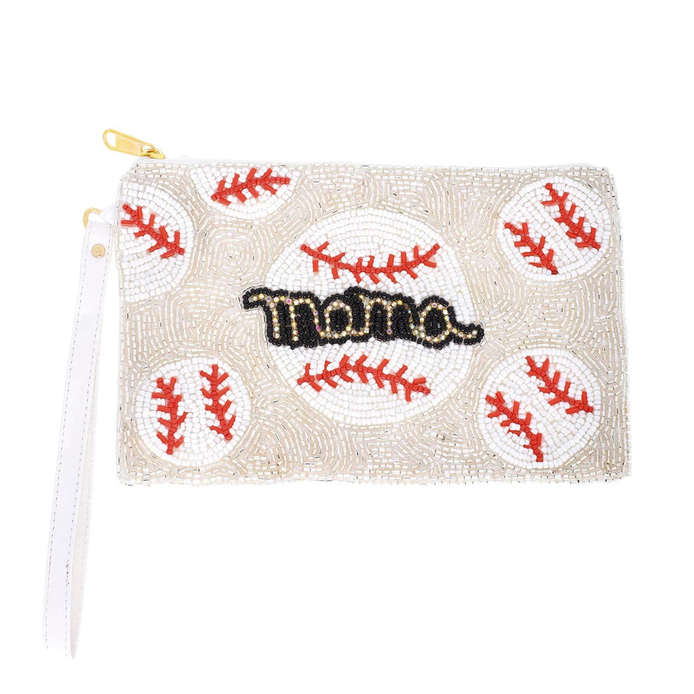 BASEBALL PATTERN GAME DAY "MAMA" SEED BEAD CRYSTAL RHINESTONE STUDDED BEADED ZIPPER COIN BAG WITH WRISTLET STRAP