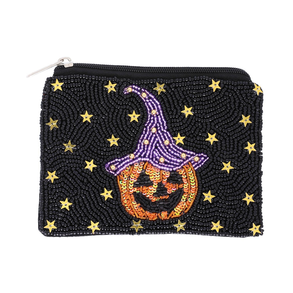 JACK O' LANTERN WIZARD HANDMADE HALLOWEEN BEADED ZIPPER COIN BAG WITH STAR SEQUIN ACCENT
