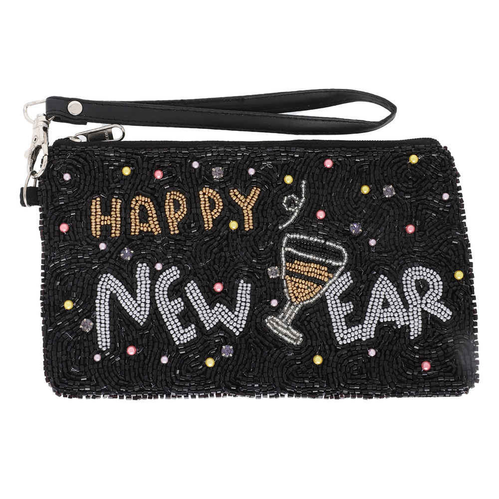 "HAPPY NEW YEAR" CHAMPAGNE TOAST CRYSTAL RHINESTONE PEARL STUDDED SEED BEAD HANDMADE BEADED ZIPPER COIN BAG WITH WRISTLET STRAP