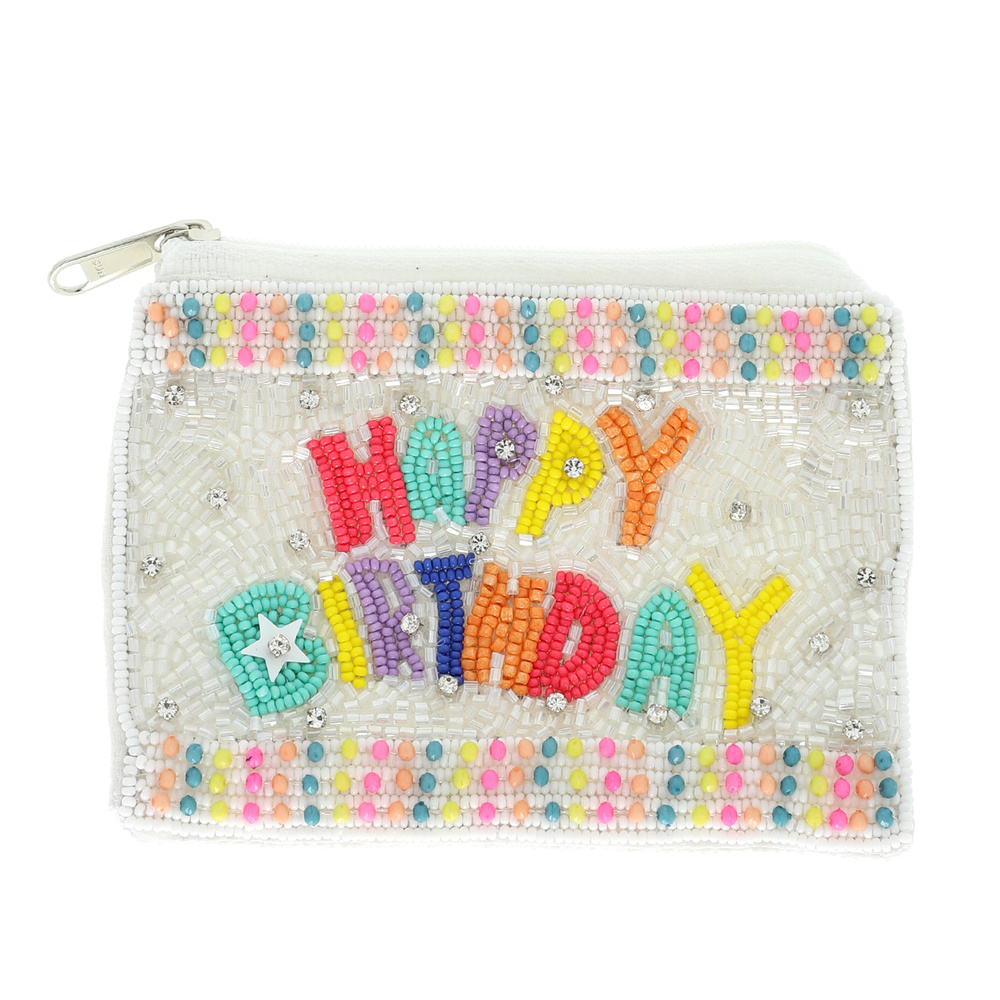 HAPPY BIRTHDAY LETTER DETAIL MULTICOLOR STRIPES BEADED EMBROIDERY CRYSTAL RHINESTONE HANDMADE ZIPPER COIN BAG