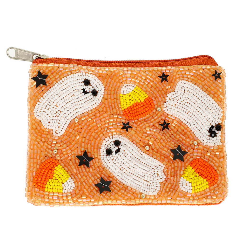 HALLOWEEN CANDY CANE GHOST SEED BEAD EMBELLISHED COIN BAG