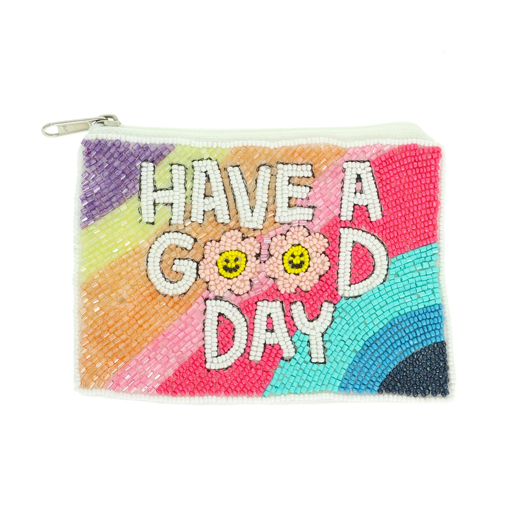 RAINBOW THEME "HAVE A GOOD DAY" SEED BEAD EMBROIDERED COIN BAG
