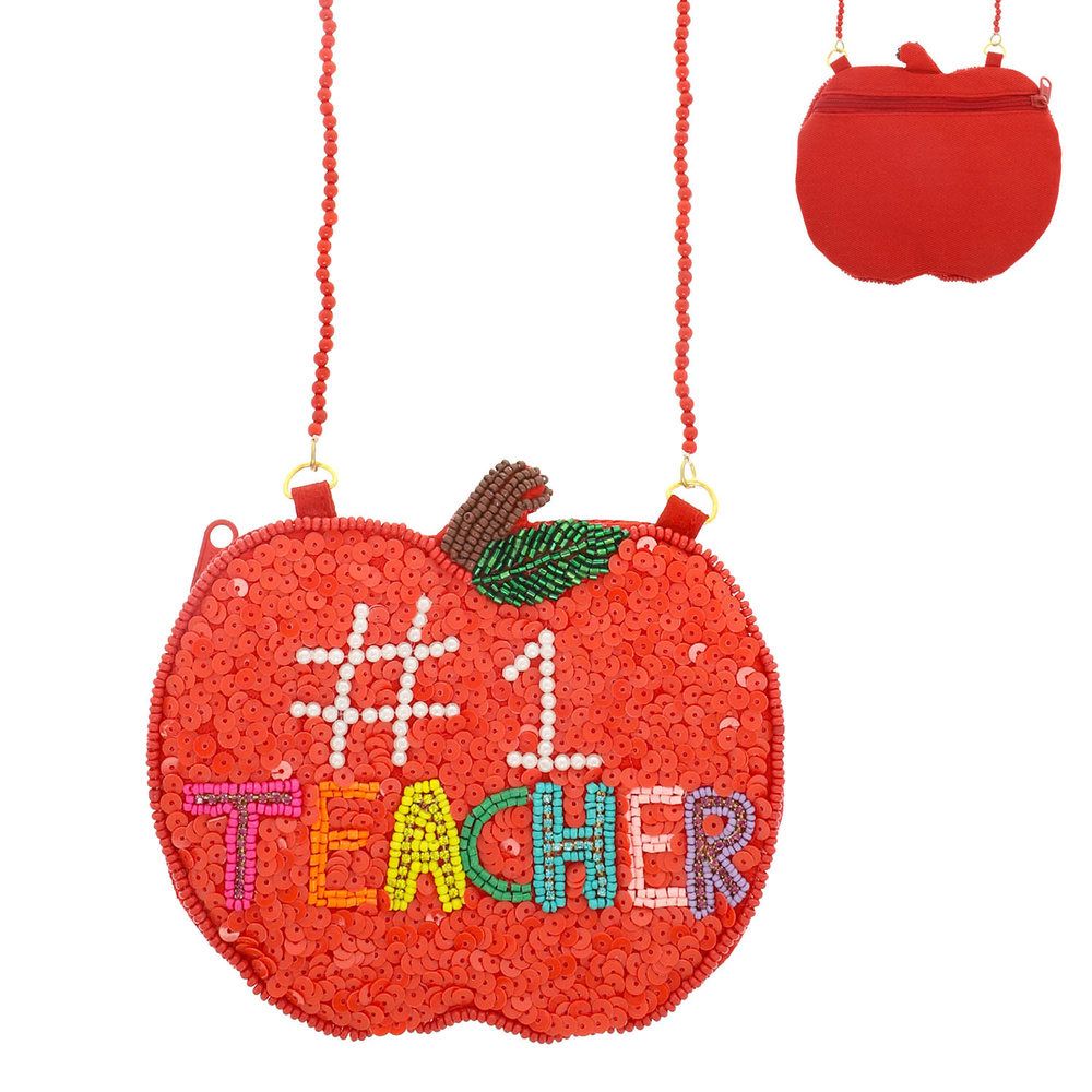 "#1 TEACHER" SEQUINS BEADED CROSSBODY APPLE BAG WITH DECORATIVE BEAD STRAP