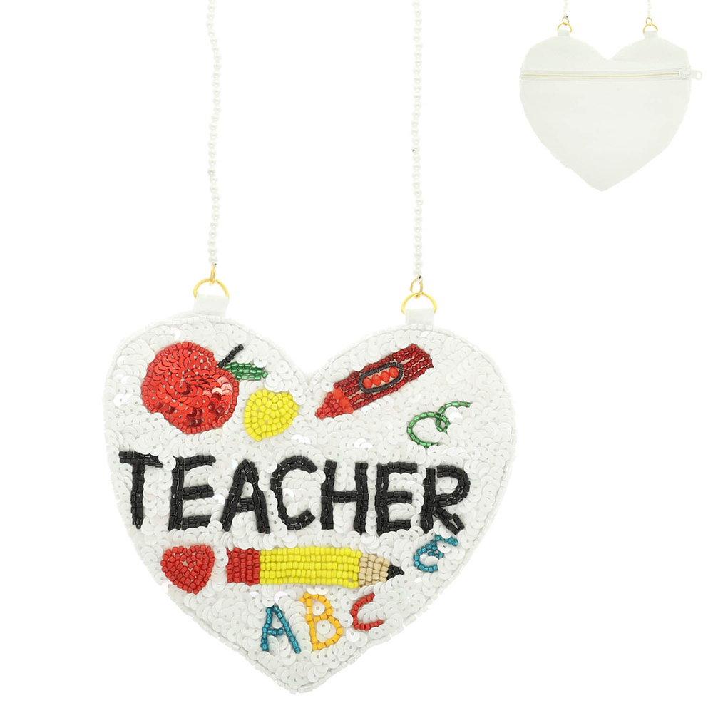 SHCOOL THEMED "TEACHER" SEQUINS SEED BEADED HEART CROSSBODY BAG