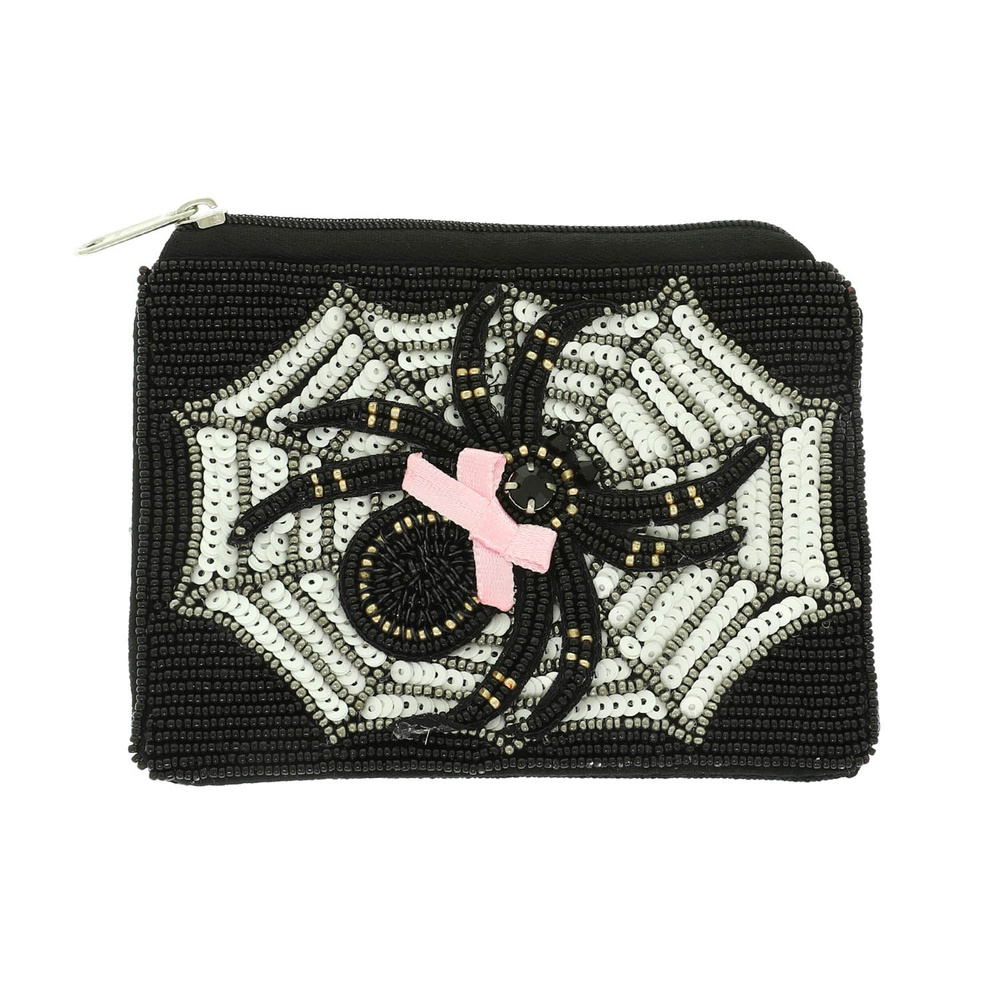 HALLOWEEN CRYSTAL SEED BEADED COIN BAG FEATURING SPIDER DESIGN WITH PINK BOW